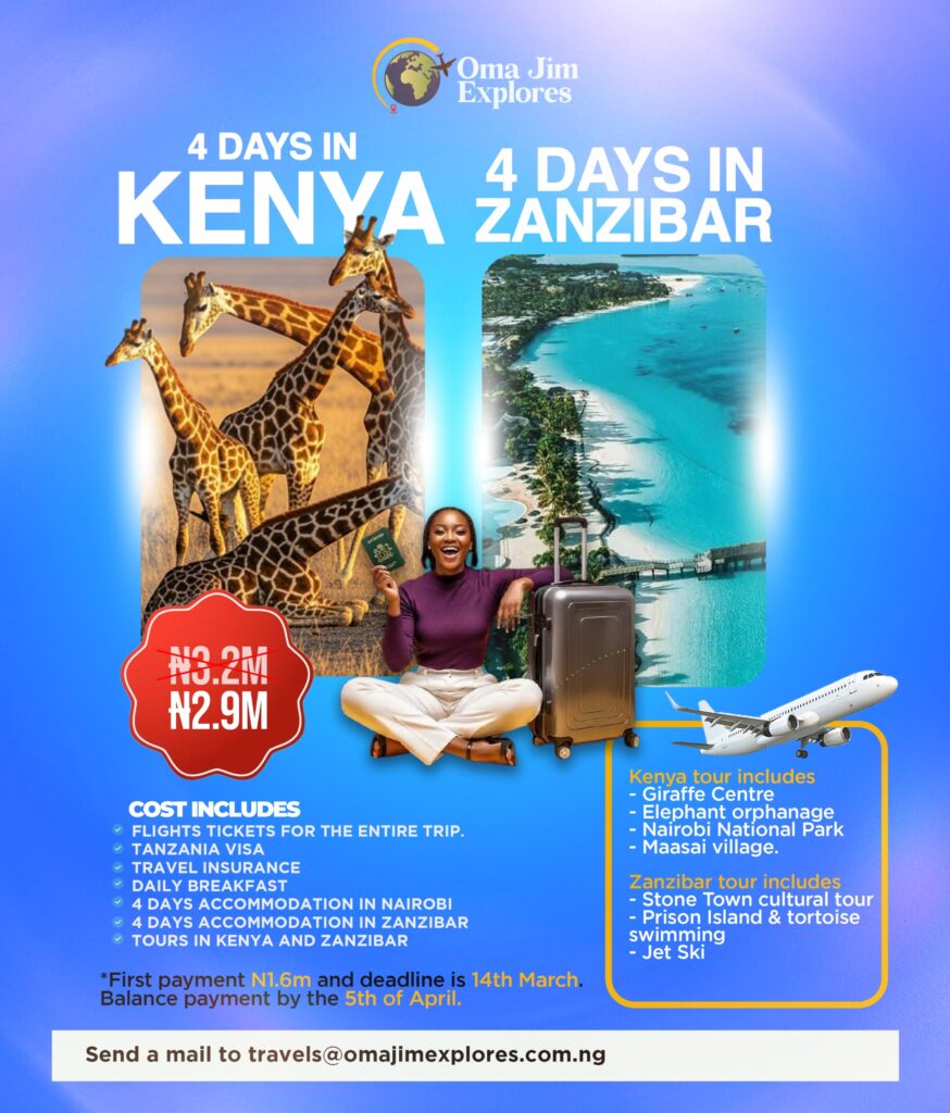 Escape to two dream destinations in one unforgettable trip with OmaJim Explores. This 8‑day East African adventure gives you 4 thrilling days in Kenya and 4 magical days in Zanzibar, all thoughtfully planned so you only have to do one thing—show up and enjoy.